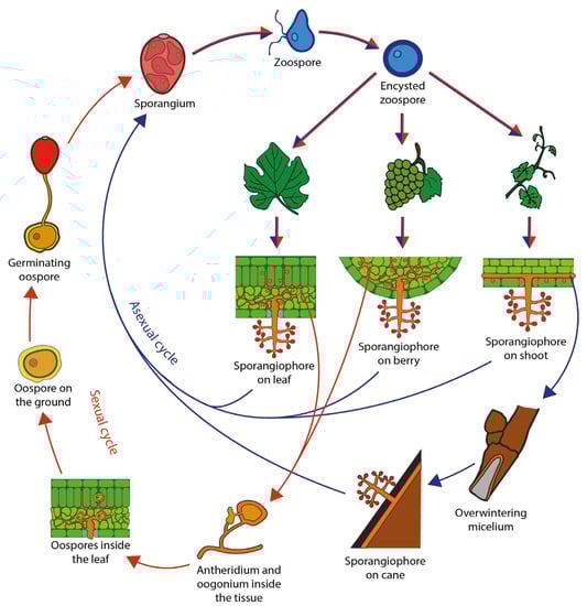 Schematic diagram of the disease cycle of downy mildew caused by Plasmopara viticola. Red arrows refer to the sexual cycle. Blue arrows refer to the asexual cycle.