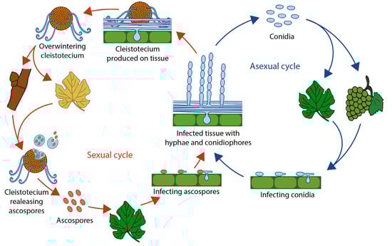 When the mycelium reaches maturity (under favorable conditions, colonies begin sporulating after five days), asexual reproduction begins with formation of chained egg-shaped conidia on short erect conidiophores. Conidia are diffused by the wind (e.g., with a speed of at least 2.3 m s−1) and do not require leaf wetness as long as the moisture conditions of the atmosphere are relatively high [12,22,23]. With cooling weather, cleistothecia are produced mainly on wood following combination of the antheridium and oogonium of different mating types. Cleistothecia are partially buried in the mycelium weft on plant tissue and, when detached, retain myceloid appendages. Some cleistothecia may release ascospores in autumn, and, in some cases, the fungus can overwinter as mycelium in infected dormant buds, which will give rise in the next growing season to so-called flag-shoots, a source of secondary infection.