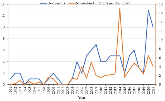 The number of documents, from 53 different journals and books, has an annual growth rate above 7%. The literature showed a significant increase since 2000, with a second rise evident in the last few years (Figure 3). The recent growth was also implied by the average age of the documents (9.44 years). The normalized number of citations per document (i.e., the average number of citations divided by the number of citable years) also indicated an increasing interest in the sector, and its trend mirrored the number of publications.