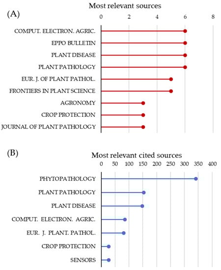Analysis of the most relevant sources well indicated the interdisciplinarity of the scientific area, with journals dealing with fundamental and applied plant pathology as well as development and application of electronics for solving problems in agriculture or plant science (Figure 4A). The most relevant cited sources were predominantly related to the field of plant pathology, underlying that the theoretical assumptions and the conceptual framework for modelling development mainly derived from information related to the study of plant diseases and pathogens (Figure 4B).
