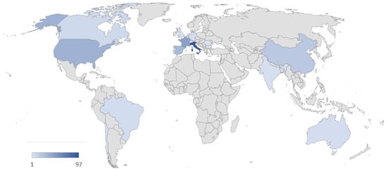 World map distribution of studies measured as the number of author appearances by country affiliation. The intensity of the blue color is proportionate to the number of papers, as indicated by the scale bar on the lower left corner.