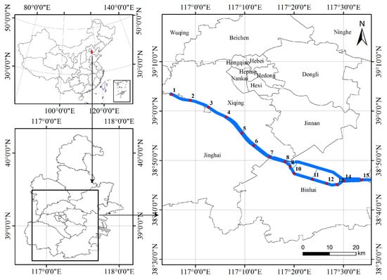 The Duliujian River, located in Tianjin City (39°3′20′′–38°46′4′′ N, 116°55′10′′–117°33′44′′ E), China, is the largest river in the lower reaches of the southern Haihe River Basin. It flows from the conjunction of the Daqing River and the Ziya River to the Bohai Bay (Figure 1) and covers a catchment area of 3737 km2 with a total length of 70.14 km and a maximum width of 1 km in the upper and middle reaches. The river basin belongs to the warm temperate zone with a semi-humid continental monsoon climate, so it has a distinct seasonal environment, windy and dry in spring, hot and rainy in summer, moderate temperature in autumn, and cold in winter. The annual average temperature in this area ranges from 12 °C to 15 °C, and precipitation is concentrated from June to September, with an annual average rainfall of about 571 mm []. The river’s seagoing nature makes it susceptible to saline intrusion. As a result, the entire river exhibits a distinct salinity gradient that, along with other abiotic environments, affects the survival, growth, and reproduction of aquatic organisms.