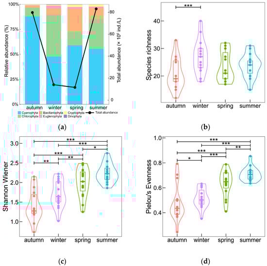 Seasonal variations of phytoplankton abundance and comparisons of the number of species, Shannon–Wiener index, and Pielou’s evenness among different seasons. (a) Relative abundance and total abundance of phytoplankton, where the bar stack diagram indicates relative abundance and point and line indicate total abundance; (b) Comparison of the number of species; (c) Comparison of Shannon–Wiener index; (d) Comparison of Pielou’s evenness. “***” denotes p < 0.01, while “**” denotes p < 0.05 and “*” p < 0.1.