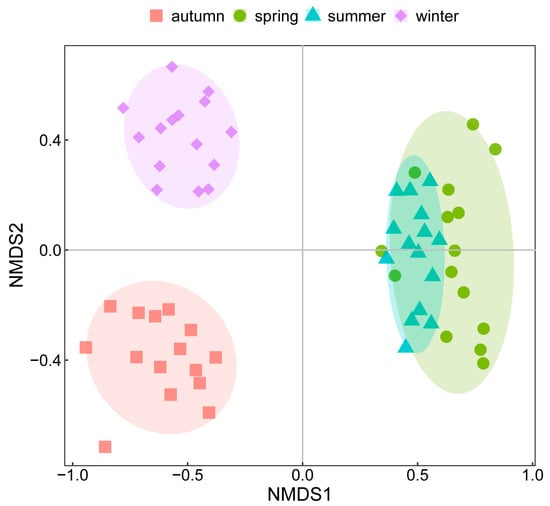 Non-metric multidimensional scaling (nMDS) was performed based on Bray–Curtis dissimilarity calculated for the species composition of the phytoplankton community (vegan package, R, v.4.1.2). Different colored and shaped points represented different seasons, and the ellipses of the confidence interval were set at the 80% level. Following this, an analysis of similarities (ANOSIM) was run to detect the significant differences (p < 0.05) among the phytoplankton communities in different seasons (vegan package, R, v.4.1.2).