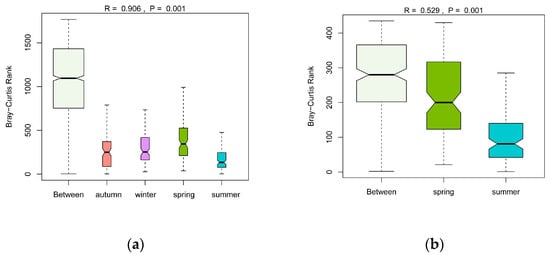 ANOSIM results of seasonal variations of phytoplankton communities: (a) for four seasons based on log-transformed abundance; (b) for spring and summer based on log-transformed abundance.