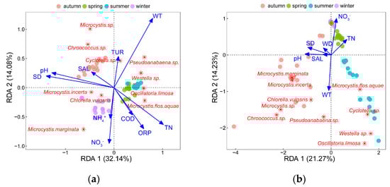 As shown in Figure 5a, NO3−, WT, pH, SD, ORP, TN, COD, TUR, NH4+, and SAL significantly affected phytoplankton abundance. It could be found that C. vulgaris and M. marginata were positively associated with NO3− and NH4+, and M. incerta presented notable positive correlations with SD and pH. Cyclotella sp., Pseudoanabaena sp., and Westella sp. were most influenced by WT. Besides this, O. limosa, and M. flos-aquae responded positively to TN and negatively to SAL. Microcystis sp. and Chroococcus sp. were negatively affected by COD and ORP.