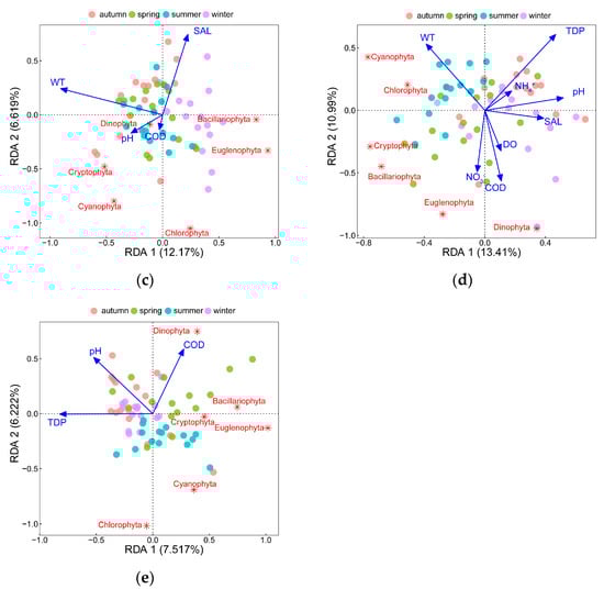 Species richness, community diversity, and community evenness were analyzed with phylum level data (Figure 5c–e). The RDA results revealed that SAL, WT, pH, and COD could explain 18.79% of the total variance of species richness (RDA1 12.17%, RDA2 6.62%). Species richness of Bacillariophyta and Euglenophyta had negative relationships with WT, while that of Chlorophyta and Cyanophyta was negatively affected by SAL. Besides this, TDP, WT, pH, COD, NO3−, SAL, DO, and NH4+ could explain 24.4% of the total variance of community diversity, among which, TDP had strongly negative relationships with the diversity of Cryptophyta and Bacillariophyta. The diversity of Chlorophyta and Cyanophyta responded negatively to SAL and positively to WT. Additionally, COD, pH, and TDP affected community evenness obviously, where TDP was negatively associated with the evenness of Bacillariophyta, Euglenophyta, and Cryptophyta, and pH was negatively associated with the evenness of Cyanophyta. COD had a significant positive relationship with Dinophyta evenness and a negative relationship with Chlorophyta.