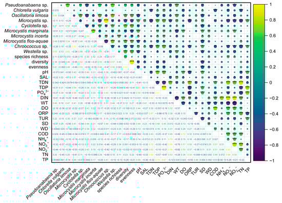 Community diversity was mainly influenced by WT and TDP, as well as pH, SAL, COD, NO3−, DO, and NH4+ (Figure 5d). It was commonly reported that water temperature drove the dynamics of community diversity in other studies, such as estuaries in the Mediterranean Sea [], and coastal waters during the monsoon in India []. In this study, WT strongly influenced the community diversity in summer and was positively correlated with the diversity of Cyanophyta and Chlorophyta. This result indicated that species of Cyanophyta and Chlorophyta were more suitable to the higher temperature in summer, and the species abundance increased with the temperature, resulting in a much more even community. Moreover, Shannon–Wiener is a classical index, reflecting the biodiversity of any population in which each member belongs to a unique group, type, or species [], implying two potential aspects of information, abundance and species number. Combined with the influence of water temperature on species richness, a conclusion could be derived that, in summer, the positive effects of water temperature on the abundance of Cyanophyta and Chlorophyta were greater than the negative effects on species richness.