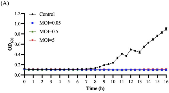 The in vitro antimicrobial activities of Ro45lw at MOIs of 0.1, 1, and 10 were determined against environmental E. coli O45:H16 (RM13752) and clinical E. coli O45:H2 (SJ7) strains at 25 °C using a spectrophotometer (Figure 7). The results showed that the bacterial growth of both E. coli O45:H16 and E. coli O45:H6 strains were completely inhibited by Ro45lw regardless of MOIs used during the 17.5 h incubation (Figure 7).