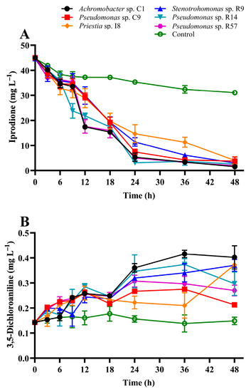 In addition to IPR removal, the production of 3, 5-DCA, its principal metabolite, was evaluated. The results show (Figure 2B) that 3, 5-DCA production was significantly different (p < 0.05) among the strains. The general trend observed was unaltered 3,5-DCA production for the control treatment. However, in the first 12 h, a mild increase in 3,5-DCA production was observed for all strains, with a concentration close to 0.25 mg L−1. After that, a metabolite increase was observed, with a final concentration of 0.40 mg L−1 when the liquid medium was inoculated with the strain Achromobacter sp. C1.