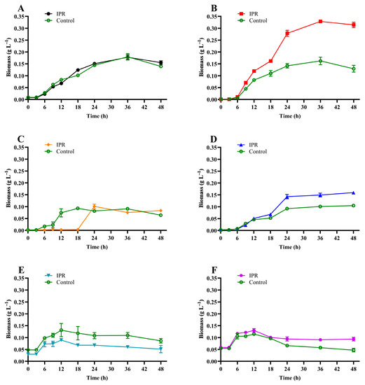The results of microbial growth (Figure 3) show that under IPR treatment, the biomass increased significantly after 6 h for all the strains except for strain I8, for which the biomass increased after 18 h under IPR treatment (Figure 3C). There was a slight difference between the microbial growth of strains R9, R14, and R57 under IPR and control treatment (Figure 3D–F) and a significant difference (p > 0.05) between both conditions for strain C9 (Figure 3B), where at 36 h, the biomass under IPR treatment presented a maximum value of 0.33 g L−1 in contrast to 0.16 g L−1 in the control. Finally, compared to the control treatment, the biomass of strain C1 was unaltered in the presence of IPR (Figure 3A). According to these results, microbial growth was described with a specific growth rate of 0.034 to 0.299 and a biomass duplication time of 2.3 to 39.1 h for the IPR treatment (Table 1).