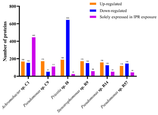 The present study focused on whole cell extracts to identify proteins associated with IPR degradation. It was carried out through a differential proteome compared with a control, profiling for all six selected strains exposed to the previous study at 50 mg L−1 IPR. For this, samples were harvested at 12 h when between 20 and 50% IPR removal was reached (Figure 2) and a significant increase in biomass was already observed (Figure 3). In this study, we found 1057, 1209, 1212, 1569, 1590, and 1740 total proteins in Pseudomonas sp. R57, Stenotrophomonas sp. R9, Pseudomonas sp. R14, Priestia sp. I8, Pseudomonas sp. C9, and Achromobacter sp. C1, respectively. The differential proteome profiling conducted for all of the strains showed several proteins with elevated (upregulated) and lowered (downregulated) levels of expression in response to IPR treatment (≥1.4 and ≥−1.4-fold), as shown in Figure 4.