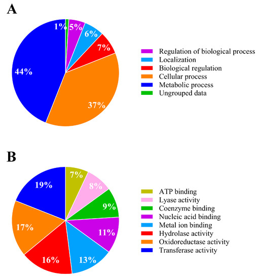 The proteome of Achromobacter sp. C1 exposed to 50 mg L−1 of IPR showed quantitative differences in expression compared to the untreated control. A total of 664 identified proteins for Achromobacter sp. C1 showed no differences between the IPR and control treatments. By contrast, 1076 proteins were differentially expressed, with 168 proteins being significantly upregulated (≥1.4-fold), 153 proteins significantly downregulated (≥−1.4-fold), and 445 proteins being solely expressed in the IPR treatment (fold change infinite) (Figure 4), indicating the induction of specific proteins/pathways that aid IPR degradation. The underlying molecular mechanism of IPR degradation was analyzed through the differentially expressed protein profiles. We found that the biological process involved in IPR degradation corresponded to the metabolic process and cellular process, representing 44% and 37%, respectively (Figure 5A). Additionally, based on the molecular function, the proteins identified in strain C1 were involved mainly in transferase activity (19%), oxidoreductase activity (17%), and hydrolase activity (16%) (Figure 5B).