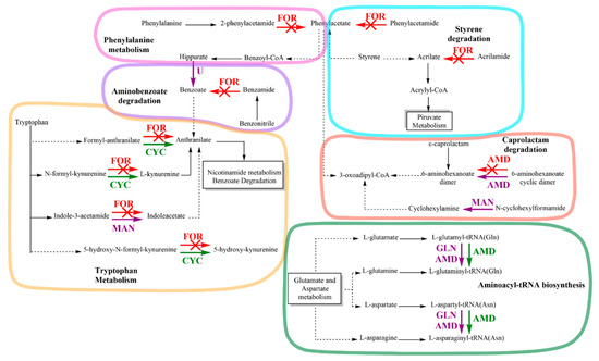 Scheme representing the metabolic changes observed for strain Achromobacter sp. C1 based on protein differential expression: (→) upregulated protein, (→) downregulated protein, and (→) solely expressed on IPR exposure. Up- and downregulated proteins are displayed in green and red with and X, respectively; those solely expressed on IPR exposure are displayed in purple. FOR, formamidase; U, uncharacterized hydrolase; CYC, cyclase; MAN, mandelamide hydrolase; AMD, amidase. GLN, glutamyl-tRNA(Gln) amidotransferase subunit A.