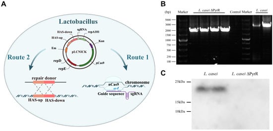 Chromosomal deletion of PyrR gene. (A) Schematic diagram of the two steps of pLCNICK-mediated PyrR knockout: the precise cutting PyrR gene in the homologous arm gene editing sites and the deletion pasting of PyrR DNA. (B) Colony PCR assays were conducted using testing primers. (C) The protein expression of PyrR were analyzed via Western blotting, which showed a wild strain of L. casei to be an immunoreactive band and the L. casei ΔPyrR strain to be a non-immunoreactive band.