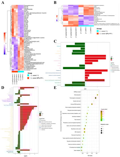 Global, non-targeted metabolomes of L. casei and L. casei ΔPyrR cell-free supernatants. (A) Heat map of 53 metabolites ranked according to the magnitude of fold differences between the L. casei and L. casei ΔPyrR group within the positive-ion mode. (B) Heat map of 18 metabolites ranked according to the magnitude of fold differences within the negative-ion mode. (C) Major differential metabolites were classified into pathways associated with biological processes from the negative-ion mode. (D) Major differential metabolites were classified into pathways associated with biological processes from the positive-ion mode. (E) Bubble map of metabolic pathway enrichment analysis. The X-axis enrichment factor (RichFactor) is the value of the differential metabolites annotated in the pathway. Larger values indicate a greater proportion of differential metabolites annotated in the pathway. The dot size represents the number of differential metabolites annotated in the pathway.
