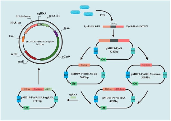All of the steps of gene cloning and plasmid construction are shown in Figure 7. According to the general principles of primer design, the PyrR gene and up/down homology arms were cloned with the up-stream/down-stream primer. The pyrimidine regulatory gene (PyrR) was cloned as the target gene from Lactobacillus casei. The PyrR and the upstream/downstream homology arms (HASup and HASdown) were amplified via PCR. The PCR product (HASup-PyrR-HASdown) was connected to the cloning vector of pMD19, which was used as the template to clone the HASup and HASdown genes. Both the HASup and HASdown genes were cloned into the cloning vector. The cloning HASup and HASdown genes were connected via fusion PCR, the PCR product of which was cloned into pMD19. To construct pMD19-sgRNA-HASup-HASdown for genome deletion, the sgRNA was connected to a single fragment of HASup-HASdown via overlap extension PCR. The resulting cassette of sgRNA-HASup-HASdown with XbaI and ApaI restriction endonuclease sites was ligated to a cloning vector of pMD19. To generate the genome-editing plasmid, which was named pLCNICK-PyrR-HAS-sgRNA, the backbone of the P23 promoter for Cas9D10A (Emr), the promoter of Pldh for sgRNA (sgRNA), and Has (obtained via the restriction endonuclease of XbaI and ApaI from the pMD19-sgRNA-HASup-HASdown plasmid) were used. All of these recombinant plasmids were chemically transformed into competent cells of E. coli TG1.
