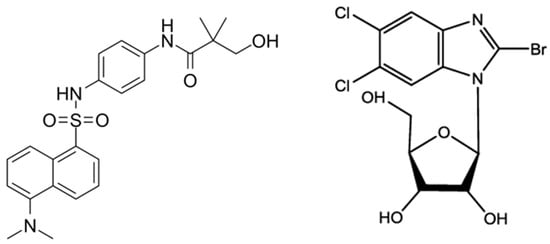- Nixon, D.E.; McVoy, M.A. Dramatic effects of 2-bromo-5,6-dichloro-1-beta-D-ribofuranosyl benzimidazole riboside on the genome structure, packaging, and egress of guinea pig cytomegalovirus. J. Virol. 2004, 78, 1623–1635. [Google Scholar] [CrossRef]