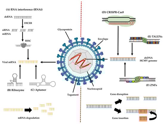 dsDNA HCMV targeting: (D) CRISPR/Cas9—through a guide RNA able to recognize the target sequence in the viral gene of interest, Cas9 nuclease makes double-stranded breaks, disrupting the target gene and allowing the insertion of unrelated DNA sequences. (E) TALENs—two discrete TALENs recognizing single nucleotides bind to specific sites at opposite viral DNA strands; then, an assembled FokI nuclease dimer cleaves the target viral gene. (F) ZNF—two discrete ZFNs recognizing nucleotide triplets bind to specific sites at opposite viral DNA strands; then, the FokI nuclease dimer disrupts the viral genome.