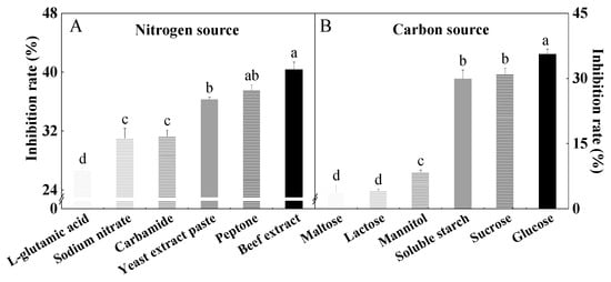 Effect of different nitrogen (A) and carbon sources (B) on the inhibition rate of HYC-7 strain fermentation broth. Vertical bars represent standard error (±SE), and different letters indicate significant differences between groups (p < 0.05).