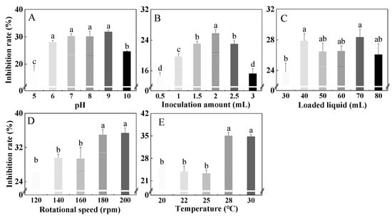 Effects of pH (A), inoculation amount (B), loaded liquid (C), rotational speed (D), and temperature (E) on the inhibition rate of the HYC-7 strain fermentation broth. Vertical bars represent standard error (±SE), and different letters indicate significant differences between groups (p < 0.05).