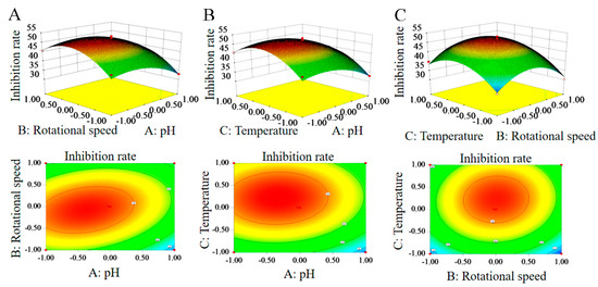 Variance analysis and the significant difference test were conducted for the regression model, and the results are shown in Table S3. The regression of the model was significant (p < 0.0001). The loss of quasi-item p = 0.1179 > 0.05 was not significant, indicating that the model was suitable with a high degree of fit, indicating that the test results were consistent with the model, while other unknown factors had little interference in the test results; the model was suitable, and the fitting degree was high, so the establishment of the regression model had a certain guiding significance. At the same time, the first A, C, and AB terms and the second A2, B2, and C2 terms all had significant antifungal activity. The correlation of the model was high with a regression coefficient of R2 = 0.9777. The regression coefficient was R2 = 0.9777; this showed that the correlation of the model was high. The F value represents the importance of each influencing factor to the test index. The larger the F value, the stronger the influence of the factor on the inhibition rate. The results showed that the influence of three factors on the inhibition rate was in the order of temperature (C, °C) > pH (A) > rotational speed (B, rpm).