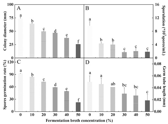 Effects of the HYC-7 strain fermentation broth with different concentrations on the colony diameter (A), sporulation (B), spore germination rate (C), and germ tubes length (D) of F. solani. Vertical bars represent standard error (±SE), and different letters indicate significant differences between groups (p < 0.05).