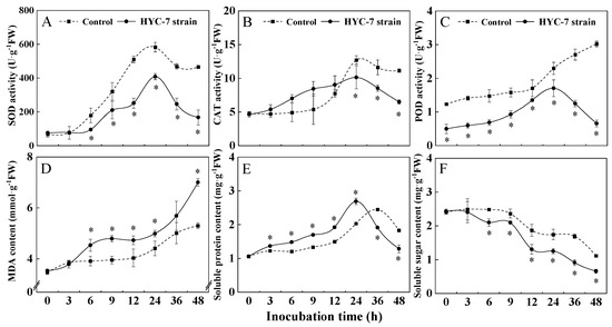 Effects of the HYC-7 strain fermentation broth on the activities of SOD (A), CAT (B), and POD (C) and the contents of MDA (D), soluble protein (E), and soluble sugar (F) of F. solani. Vertical bars represent standard error (±SE), and asterisks indicate significant differences between the treatment and the control at the same time (p < 0.05). SOD: Superoxide dismutase; CAT: catalase; POD: peroxidase; MDA: malondialdehyde.