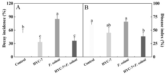 Effect of the HYC-7 strain fermentation broth on the decay incidence (A) and disease index (B) of wolfberry root rot. Vertical bars represent standard error (±SE), and different letters indicate significant differences between groups (p < 0.05).