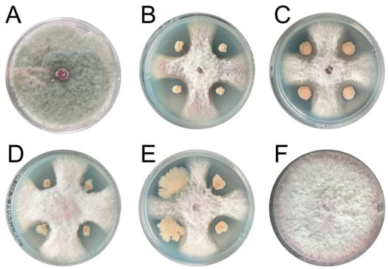FO was placed at the center of a cake dish containing the PDA and LB media (http://www.biozj.com, accessed on 30 October 2022), and then the strains were inoculated 2.5 cm away from each other. The other Petri dish was not inoculated with the biocontrol strain; only FO was inoculated as a control. After 12 days of incubation at 28 °C, the length and width of the pathogen colony were measured to evaluate the antibacterial effect of the isolated strains. The inhibition rate was calculated as (D−B)/D (100%) (D: CK, colony diameter; B: Colony width of the treated pathogen). Each treatment was repeated three times. Only the pathogen cake was taken as the control (CK), and the average value of three replicates was taken.