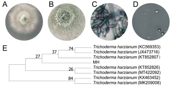 Screening and identification of T. harzianum. (A) only on PDA (initial stage); (B) Colony reverse on PDA (late stage); (C) Conidiophore; (D) Conidium; (E) hylogenetic tree of MH.Where (C) is 40× for microscope observation and (D) is 100× for microscope observation.