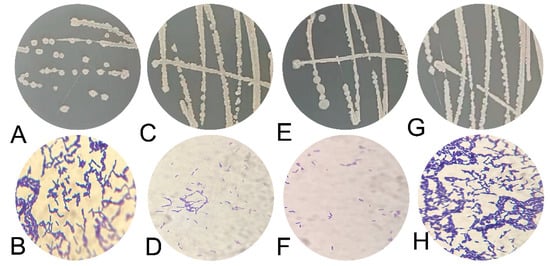 The morphological characteristics of the four isolated bacteria were observed with 100× oil mirror. Individual bacterial forms and grade staining of strain CJ5 in (A,B), respectively; individual colonies and grade staining of strain CJ7 in (C,D), respectively; individual colonies and grade staining of strain CJ8 in (E,F), respectively; individual colonies and grade staining of strain CJ9 in (G,H), respectively (n = 3).
