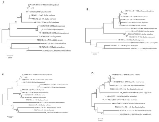 Phylogenetic tree of four biocontrol bacteria. (A) CJ5 is B. amylolyticus; (B) CJ7 is B. amylolyticus; (C) CJ8 is B. amylolyticus; (D) CJ9 is B. subtilis.