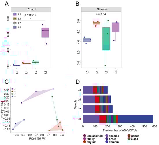 The microbial α diversity in the rhizosphere soil of A. chinensis treated with L3, L4, L7, and L8 was determined. Compared with the Chao1 index of L3, the Chao1 indices of L4, L7, and L8 increased, while that of L8 soil significantly increased (Figure 5A). No significant difference was observed in the Shannon index (Figure 5B). The results indicate that the L8 treatment increased the fungal diversity of the A. chinensis rhizosphere soil. In addition, the overall patterns of the fungal communities in the rhizosphere soil of A. chinensis treated with L3, L4, L7, and L8 were evaluated via the Bray–Curtis distance-based PCoA ranking method (Figure 5C). In the PCoA of fungal communities, the first principal component (PCo1) and the second principal component (PCo2) could explain 25.7% and 15.6% of all variables, respectively. In summary, the fungal composition of the A. chinensis rhizosphere soil treated with the L3, L4, L7, and L8 treatments presented varying trends (Figure 5C). The results of further analysis of the changes in the number of ASVs in each treatment in domains, phyla, class, order, family, genus, and species are shown in Figure 5D. After treatment with biocontrol fungi, the number of ASVs in each taxonomy was higher than that of the L3 treatment. Then, a combination of T. harzianum and Bacillus spp. was applied. The biological control fungi of A. chinensis may inhibit the growth of some harmful fungi in the rhizosphere soil to achieve certain control effects.
