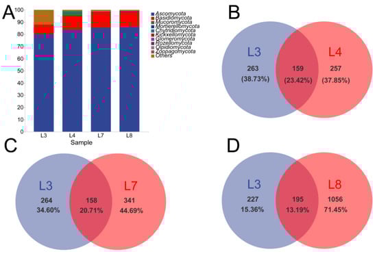Gate level of the top 10 fungi (A) in average relative abundance, abscess is the name of each sample, ordinate is the average relative abundance of each dominant group, Venn diagram of fungi (B–D) from different organisms treating ASV in soil. L3 means FO, L4 means MH + FO, L7 means CJ5 + CJ7 + CJ8 + CJ9 + FO, and L8 means CJ5 + CJ7 + CJ8 + CJ9 + MH + FO (n = 3).