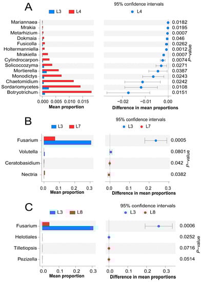 At the fungal genus level, stamp analysis was performed on soil treated with different biocontrol bacteria (p < 0.05) to further determine the response of microorganisms to soil treated with different biocontrol bacteria, namely, L3, L4, L7, and L8 (Figure 7). The fungal genus level included 14 different groups of L3 compared with that in L4 (p < 0.05); the relative abundance of these 14 different groups was significantly higher than that of L3 (p < 0.05). The relative abundances of Mrakiella, Metarhizium, Holtermanniella, and Cylindrocarpon in L3 significantly decreased (p < 0.01) (Figure 7A). L3 had four different groups compared with L7 (p < 0.05). The relative abundances of Fusarium and Volutella in the soil treated with L7 were significantly decreased, while the relative abundances of Nectria and Ceratobasidium were significantly increased (p < 0.05) (Figure 7B). In addition, compared with the abundance in L3-treated soil, the relative abundances of Fusarium and Helotiales in L8-treated soil were significantly reduced, whereas the relative abundances of Pezizella and Tilletiopsis significantly increased (p < 0.05) (Figure 7C).