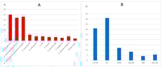The proportional distribution of the detected bacteria (A) and antibiotic-resistance genes (B). CTX-M: cefotaximase-Munich, KPC: Klebsiella pneumoniae carbapenemase, NDM: New Delhi metallo-beta-lactamase, OXA-48: OXA-48 carbapenemase, VIM: Verona integron-encoded metallo-beta-lactamase, Mec-A/C: methicillin-resistance gene.