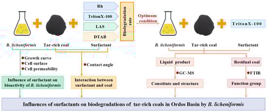 Bacillus licheniformis (B. licheniformis) has been extensively evaluated for its usage in biodegradation of coal [27,28]. Jiang [29] showed that Bacillus sp. Y7 could degrade more than 36.77% of lignite in 12 days. Akimbekov [30] demonstrated that almost 24% of crude lignite was solubilized within 14 days by Bacillus sp. Therefore, in this study, B. licheniformis was used to degrade tar-rich coal in the Ordos Basin. The optimal biodegradation conditions were obtained through single-factor experiments and orthogonal experiments. The influences of four surfactants—a biological surfactant (Rh), a nonionic surfactant (Triton X-100), an anionic surfactant (LAS), and a cationic surfactant (DTAB)—on the biodegradation were further studied. The biodegradation mechanism was investigated using the growth curve, CSH, cell permeability of B. licheniformis, and the contact angle between the coal surface and surfactant solution. The structures and compositions of biodegradation products were analyzed with FTIR and GC-MS. The degradation experimental process is shown in Figure 1.