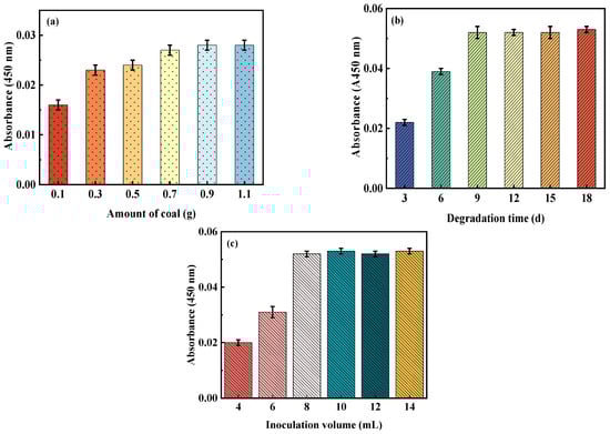 With the increase in the amount of coal, the A450 of the biodegradation liquid product increased initially and then leveled off. The results showed that low concentrations of coal depressed the efficiency of biodegradation, while the effect of high concentrations was not significant. The optimal amount of coal was 0.9 g (the concentration of coal was 18 g·L−1) (Figure 2a). This is because when the available bacteria nutrients were exhausted, they could not subsist with coal as the nutrient source. The amount of coal that could be degraded by bacteria was limited. Consequently, when the available nutrients for the bacteria were exhausted, the biodegradation effects of oxidized coals were no longer enhanced.