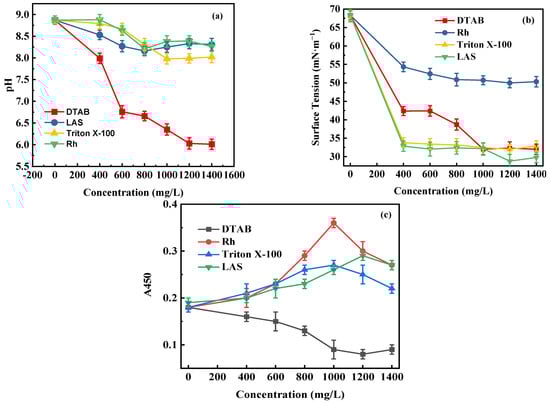 The influences of the four surfactants on pH value, surface tension, and A450 of the supernatant liquid are shown in Figure 3. With the increase in the concentration of DTAB, the pH value, surface tension, and A450 of the supernatant liquid decreased. The reason for this might be that the acidic environment inhibited the growth of bacteria, and the bacteria could not degrade the oxidized coals through metabolism. However, with the increase in the concentration of Rh, Triton X-100, and LAS, each supernatant liquid always remained alkaline. The A450 of Rh, Triton X-100, and LAS were enhanced first and then weakened, and the optimal concentrations were 1200, 1000, and 1000 mg/L, respectively. The surface tensions of the supernatant liquid decreased first and then leveled off with the increase in Rh, Triton X-100, and LAS concentrations.