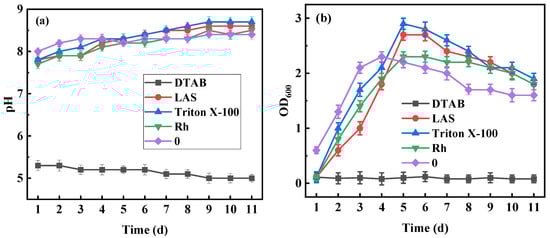 The OD600 and pH value changes of B. licheniformis in a liquid medium are shown in Figure 4. After adding Rh, Triton X-100, or LAS, the pH value of the medium remained alkaline, which was conducive to the growth of B. licheniformis, while the pH value in the medium was acidic in the presence of DTAB, which might inhibit the growth of strains.