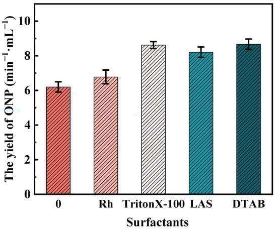 The abilities of the four surfactants to permeate the cell membrane of B. licheniformis were evaluated by the release of cytoplasmic ONP. As shown in Figure 6, the yields of ONP under the actions of Rh, Triton X-100, LAS, DTAB, and surfactant-free control were 6.78%, 8.62%, 8.21%, 8.67%, and 6.20%, respectively. All surfactants showed a notable ability to promote cell permeability. The sequence in which Rh, Triton X-100, and LAS elevated cell permeability matched the sequence in which they enhanced biodegradation rates. Besides DTAB, Triton X-100 showed the most significant improvement in cell permeabilities. Van Hamme [37] found that the alteration of the membrane permeability was caused by the membrane absorption of surfactant molecules at relatively low surfactant concentrations. Li [10] reported that the increase in cell membrane permeability was conducive to the transmembrane transport rate of phenanthrene.