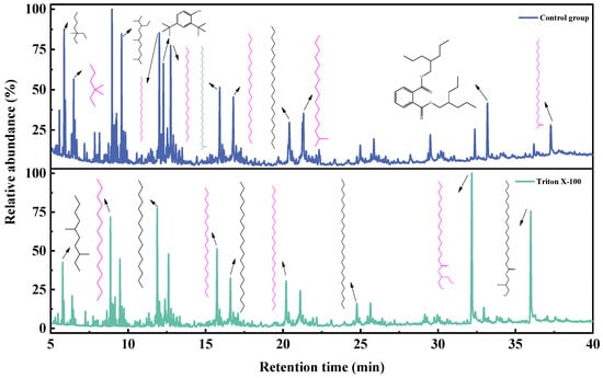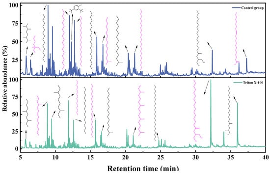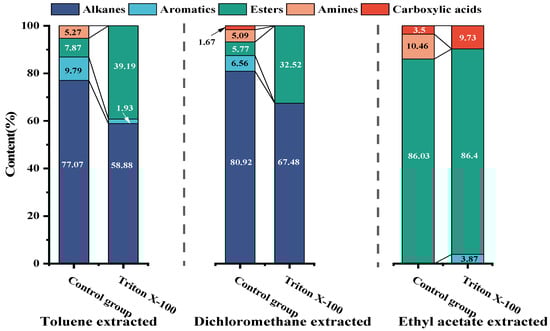 The GC-MS of the dichloromethane extract is shown in Figure 9; the trend of the liquid products before and after the action of Triton X-100 was similar, with 14 compounds being identical. The main components of the dichloromethane extract liquid are shown in Figure 8, and details are listed in Table 8. The dichloromethane-extracted liquid from the control group contained 26 compounds, mainly including alkanes, comprising 80.91%; aromatics, comprising 6.56%; esters, comprising 5.77%; amines, comprising 5.09%; and carboxylic acids, comprising 1.67%. With the surfactant treatment, the number of compounds in the dichloromethane extract liquid reduced to 20, only retaining alkanes (67.48%) and esters (32.52%), while carboxylic acids, amines, and aromatics disappeared. Meanwhile, hexadecane increased from 5.34% to 15.10%, hexadecanoic acid, 2-hydroxy-1-(hydroxymethyl) ethyl ester increased from 3.57% to 17.50%, and octadecanoic acid, 3-dihydroxypropyl ester increased from 2.20% to 13.11%.