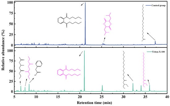In conclusion, after the action of Triton X-100, the number of identified degradation compounds in the toluene and dichloromethane extract of the liquid product decreased by 16 and 6, respectively, but the number in the ethyl acetate extract increased by 6. At the same time, the contents of alkanes in the extracts of toluene and dichloromethane decreased, and lipids increased while the ethyl acetate extract changed little. The degraded liquid products were mainly aromatic hydrocarbons, long-chain alkanes, aldehydes, ketones, and ether esters, consistent with Akimbekov’s report [30]. The results also showed that adding suitable surfactants could promote the enrichment of degradation products. In liquid products, alkanes are commonly used as industrial fuels; octadecanoic acid, 2,3-dihydroxypropyl ester is widely used as emulsifiers in the food, medicine, cosmetics, and detergent industries; and dibutyl phthalate is used as a plasticizer for acetate fiber, polyvinyl chloride, etc.