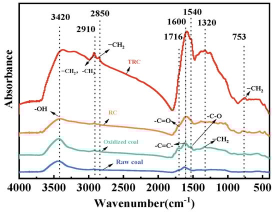 The FTIR spectra of TRC, RC, oxidized coal, and raw coal are shown in Figure 11, and the peak shape trends of the four coal samples are similar. The absorption bands of products were at 3420 cm−1 and 1600 cm−1, which were the stretching vibration peaks of the carboxyl group and aromatic ring, respectively. After nitric acid treatment, new absorption bands appeared in oxidized coal at 1716 cm−1, 1540 cm−1, and 1320 cm−1, which were the characteristic peaks of the carboxyl group, nitro group, and hydroxyl group, respectively. These changes indicated that nitric acid pretreatment increased the number of carbon-based functional groups in oxidized coals and introduced -NH2, meaning that the raw coal was oxidized by nitric acid [17]. The absorption bands of residual coal from the control group disappeared at 1540 cm−1, indicating that the bacteria degraded the fragments containing C=O and N=O functional groups from the macromolecular structure of coal. After the action of Triton X-100, new absorption bands appeared at 2910 cm−1 and 2850 cm−1, which were the absorption peaks of aliphatic methyl and methylene. The results showed that Triton X-100 promoted B. licheniformis to degrade the aromatic ring in coal, increasing the aliphatic substances. The absorption peaks at 753 cm−1 were the characteristic peaks of aromatic vibration [39]. Compared with oxidized coal, there was a new absorption band of RC and TRC, which might be due to the depolymerization of polycyclic aromatic hydrocarbons in it.