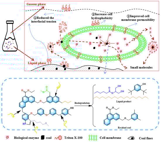 The possible process by which Triton X-100 promotes the biodegradation of coal is shown in Figure 12. On the one hand, Triton X-100 could reduce the interfacial tension between oxidized coal, macromolecules, and water and promote the diffusion of macromolecules from the coal to the water phase. This transfer of macromolecules increased the possibility of microbial contact with macromolecules and promoted the microbial degradation of oxidized coals. On the other hand, surfactants also increased the hydrophobicity of the cell surface, making it easier for macromolecular substances in coal to be adsorbed by the surface of the bacteria [41]. In addition, the cell membrane of the strain was amphiphilic, which was similar to the structure of the surfactant. Surfactant molecules changed the permeability of the cell membrane by inserting into the cell membrane so as to promote the macromolecules in coal to enter the bacterium, and the enzyme secreted by the bacterium was transferred out of the cell membrane [42,43].