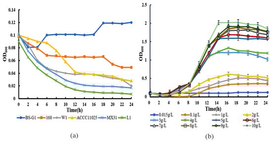 Growth curve. (a) Growth curves of B. subtilis BS-G1 and five control strains at 0.015 g/L glucose concentration; (b) Growth curves of B. subtilis BS-G1 at different glucose concentrations.