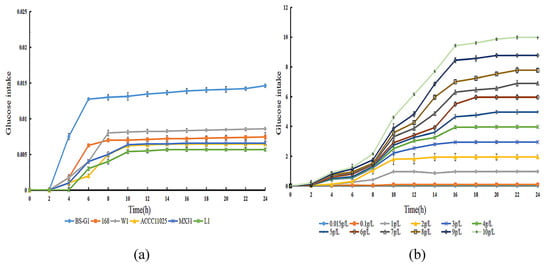 By determining the sugar uptake curves of B. subtilis BS-G1 and five control strains at a 0.015 g/L glucose concentration, it was found that the fastest rate of sugar uptake was found in B. subtilis BS-G1 (Figure 2a). The rate of sugar uptake of B. subtilis BS-G1 in the range of 0.015–10 g/L glucose sugar concentration was found to increase with the increase in the glucose concentration, and the strain sugar uptake curve reached a stabilization period at 16 h of incubation (Figure 2b).