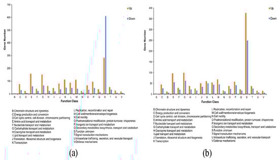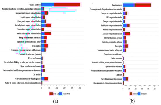 COG functional classification of DEGs. (a) COG functional classification results of LvsH; (b) COG functional classification results of MvsH.