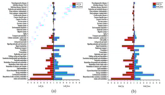 KEGG functional classification of DEGs. (a) KEGG functional classification results of LvsH; (b) KEGG functional classification results of MvsH.